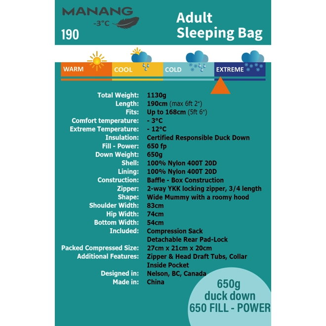 SHISHKA MANANG 190 Down Adult sleeping bag is a high-quality product that offers ultimate warmth and comfort. Its natural duck-down insulation, RDS certified, provides excellent warmth retention while still being lightweight and compressible. With its 650g of down weight, and 650 Fill-Power, this sleeping bag is designed to provide enough warmth, and its comfort temperature is rated -3°C, and extreme as low as -15°C.