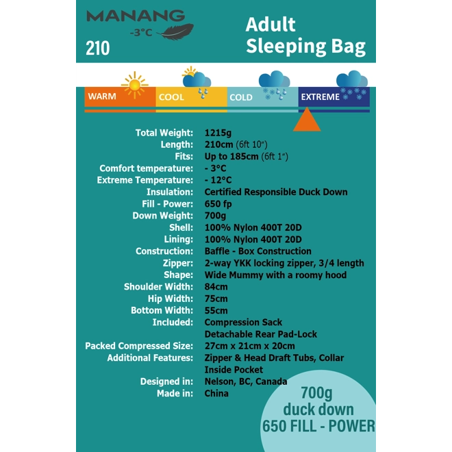 SHISHKA MANANG 210 Down Adult sleeping bag is a high-quality product that offers ultimate warmth and comfort. Its natural duck-down insulation, RDS certified, provides excellent warmth retention while still being lightweight and compressible. With its 700g of down weight, and 650 Fill-Power, this sleeping bag is designed to provide enough warmth, and its comfort temperature is rated -3°C, and extreme as low as -15°C.